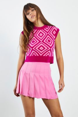 Glamorous Pink Diamond Geo Knit Crew Neck Vest Top. For the colour lovers out there, this cute vest top is perfect! Featuring crew neck style neckline, in an bright pink diamond intarsia knit design , this on-trend vest top is a must have for your wardrobe. Perfect for layering with, but also looks great just teamed with jeans.