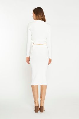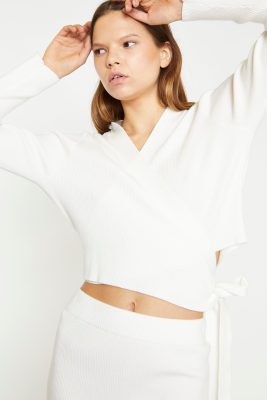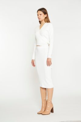 Glamorous Womens Off White Rib Knit Wrap-Top. Timeless and super versatile, this top will always look effortless and elegant. Featuring a flattering wrap fit with tie side detail and a V-neckline in a luxe rib knit, this piece is perfect for you! Style with our matching midi skirt for the perfect co-ord vibe this Spring.