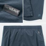 Tech WEAVE fabric with DWR coating (durable water repellent finish) is used. The fabric is wind and water resistant, stretchable, and durable.