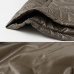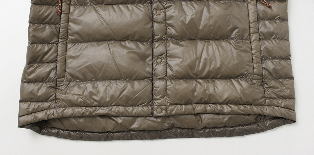 The outer fabric is a densely woven 10 denier ripstop nylon fabric. Although thin, it is highly durable in terms of water repellency and tearing, and the softness of the down gives it an appealing feel.