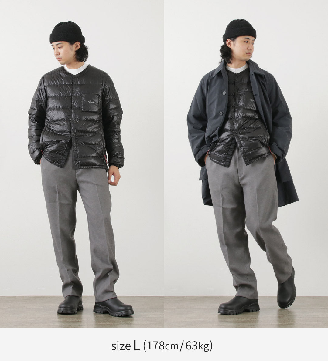 Minimal and practical looks that can be used as inner down or as a single piece of outerwear. The well-balanced silhouette of the body width and length is ideal for a wide range of uses, from outdoor activities to town use.
