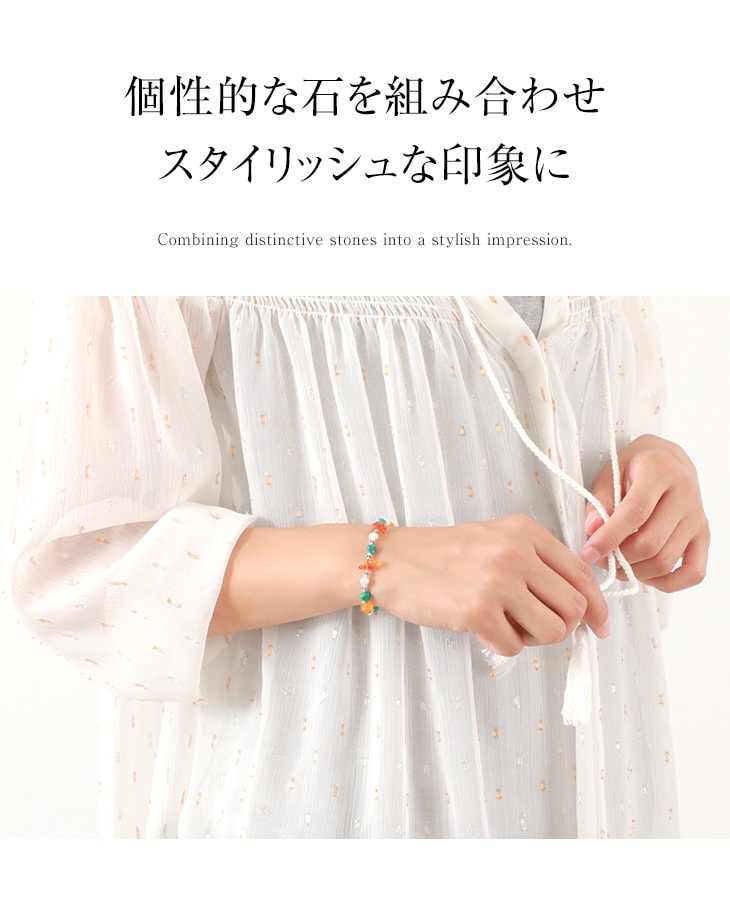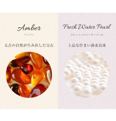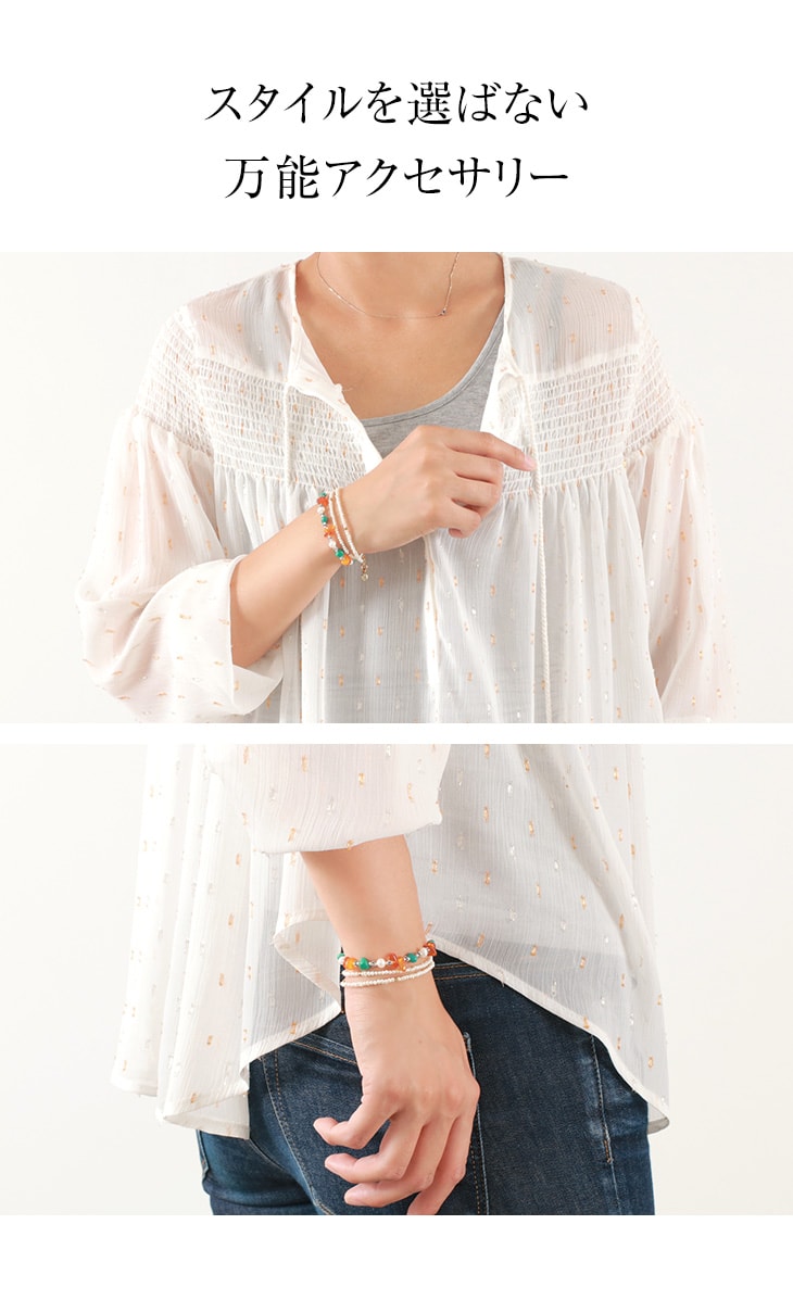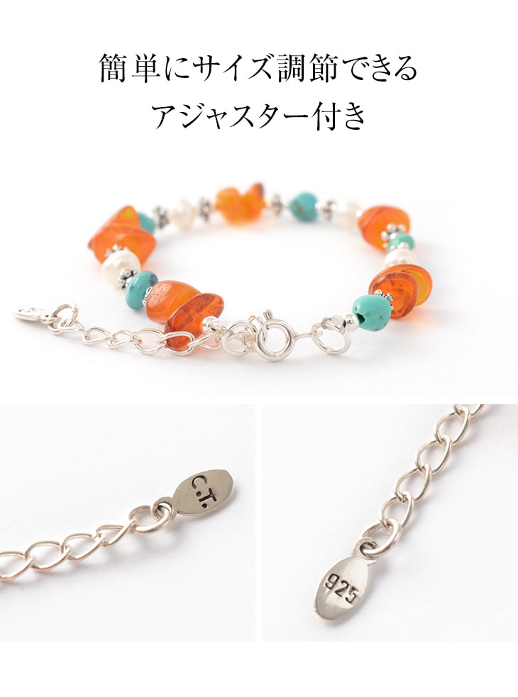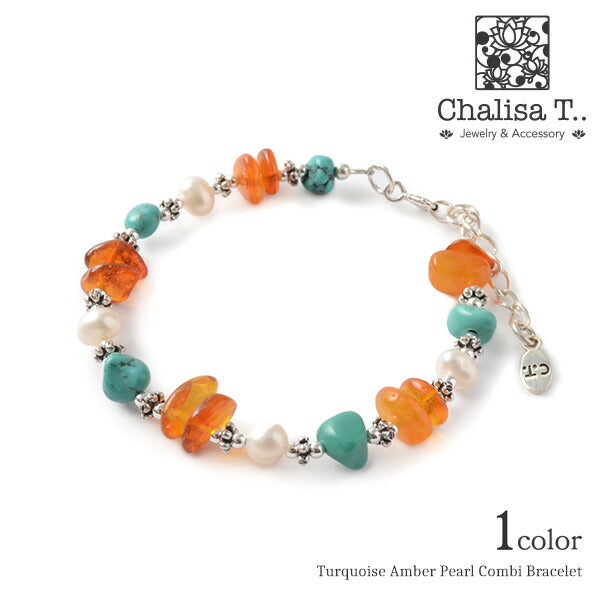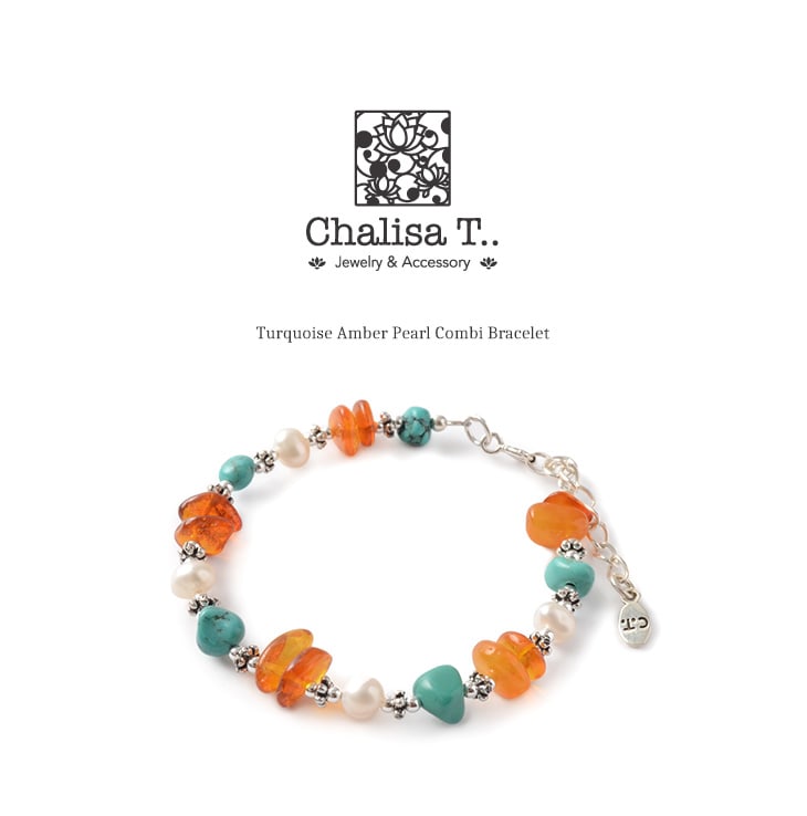 This bracelet is a balanced combination of turquoise, amber and fresh water pearls. The combination of turquoise, amber and fresh water pearls, all of which have a strong personality on their own, creates a stylish look. The use of amber, which is rarely seen in casual accessories, gives the brand its own colour.