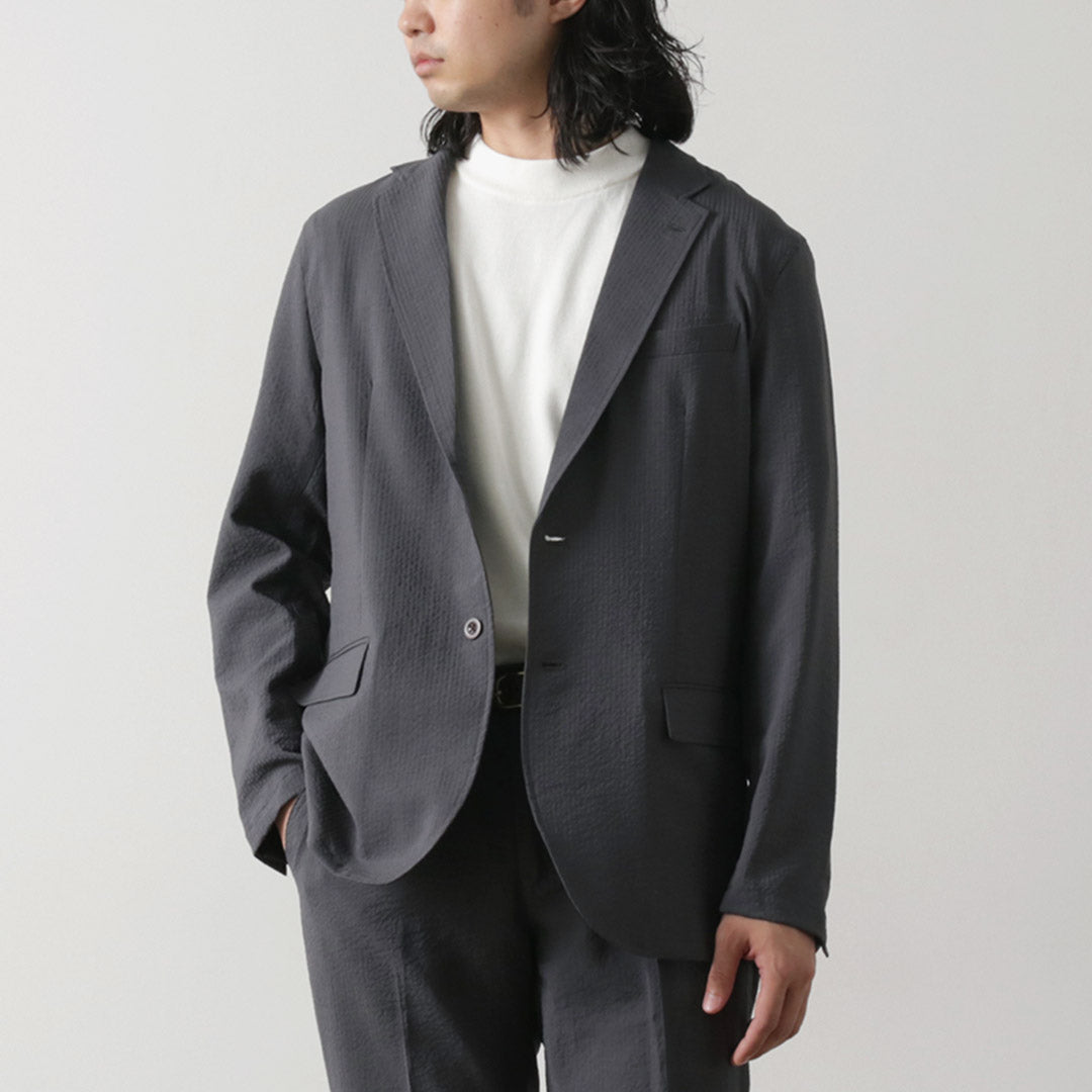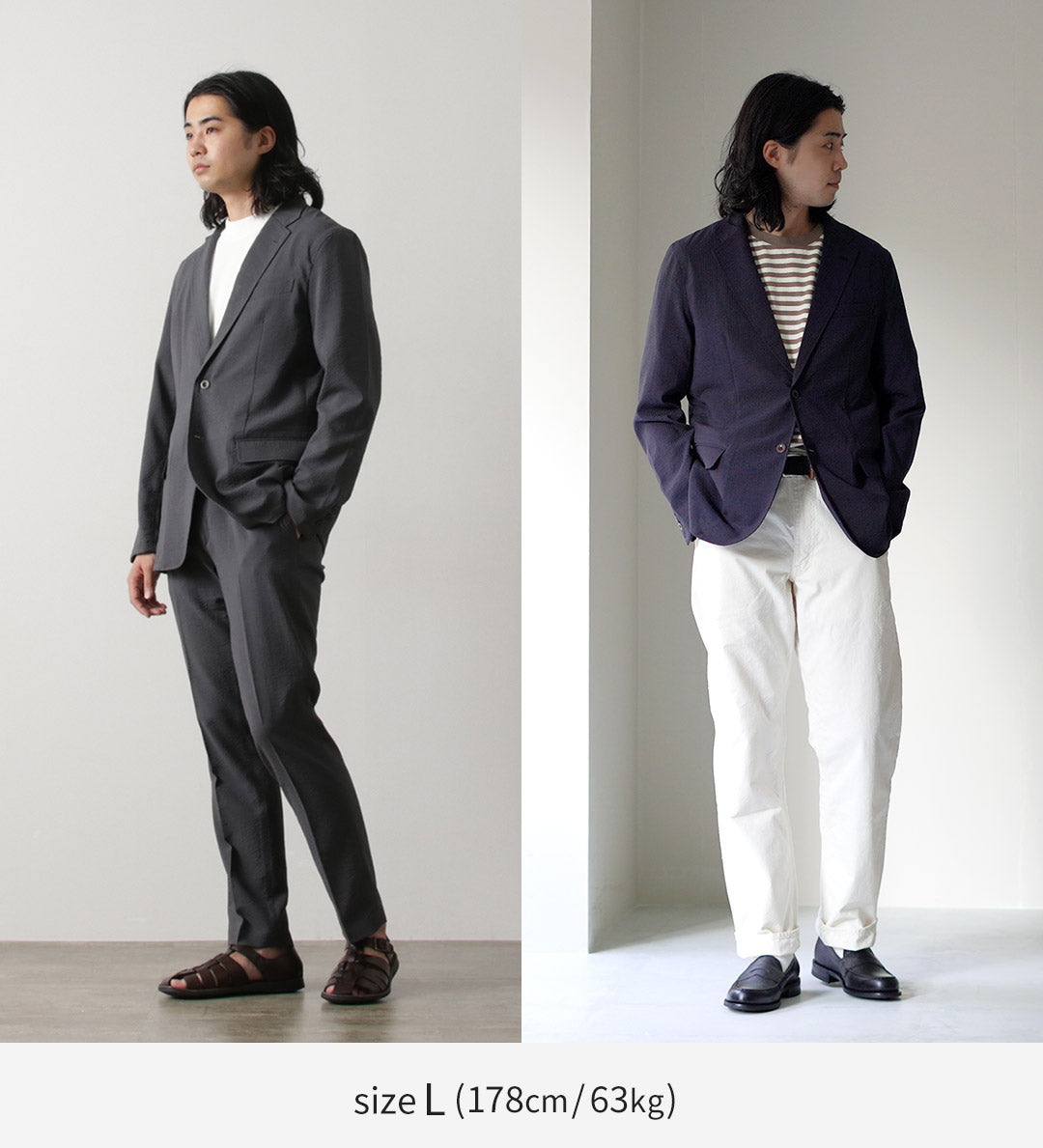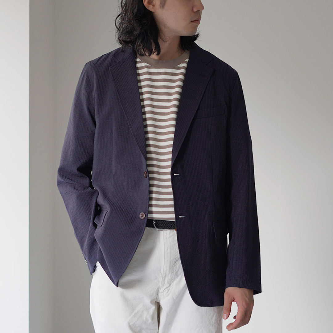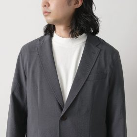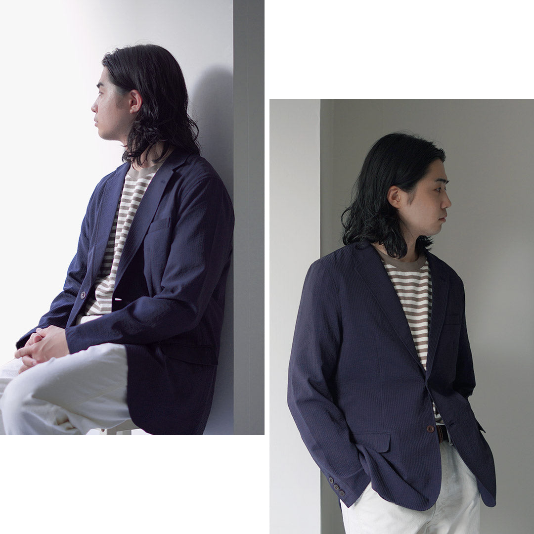 Wearing it as a set-up with matching pants is also recommended. Especially in business scenes where a jacket is needed during the sweaty season, this seersucker set-up, known for its dry touch and coolness, allows you to wear it comfortably without worrying about stickiness.