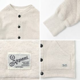 The basic design is easy to style and is accented with large cat-eye buttons. The Raffy-lined knit, synonymous with KEPANI, is used to create a uniquely soft feel on the skin.