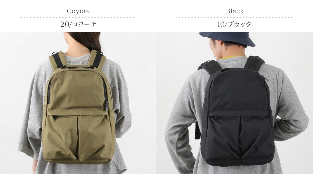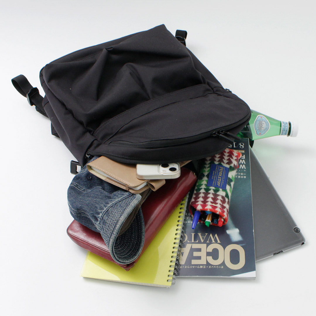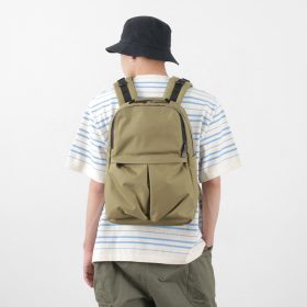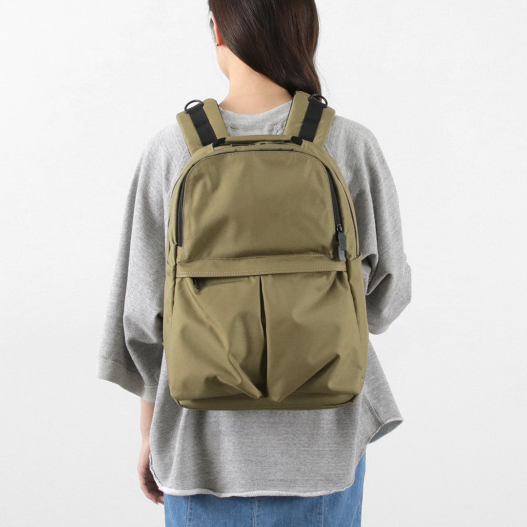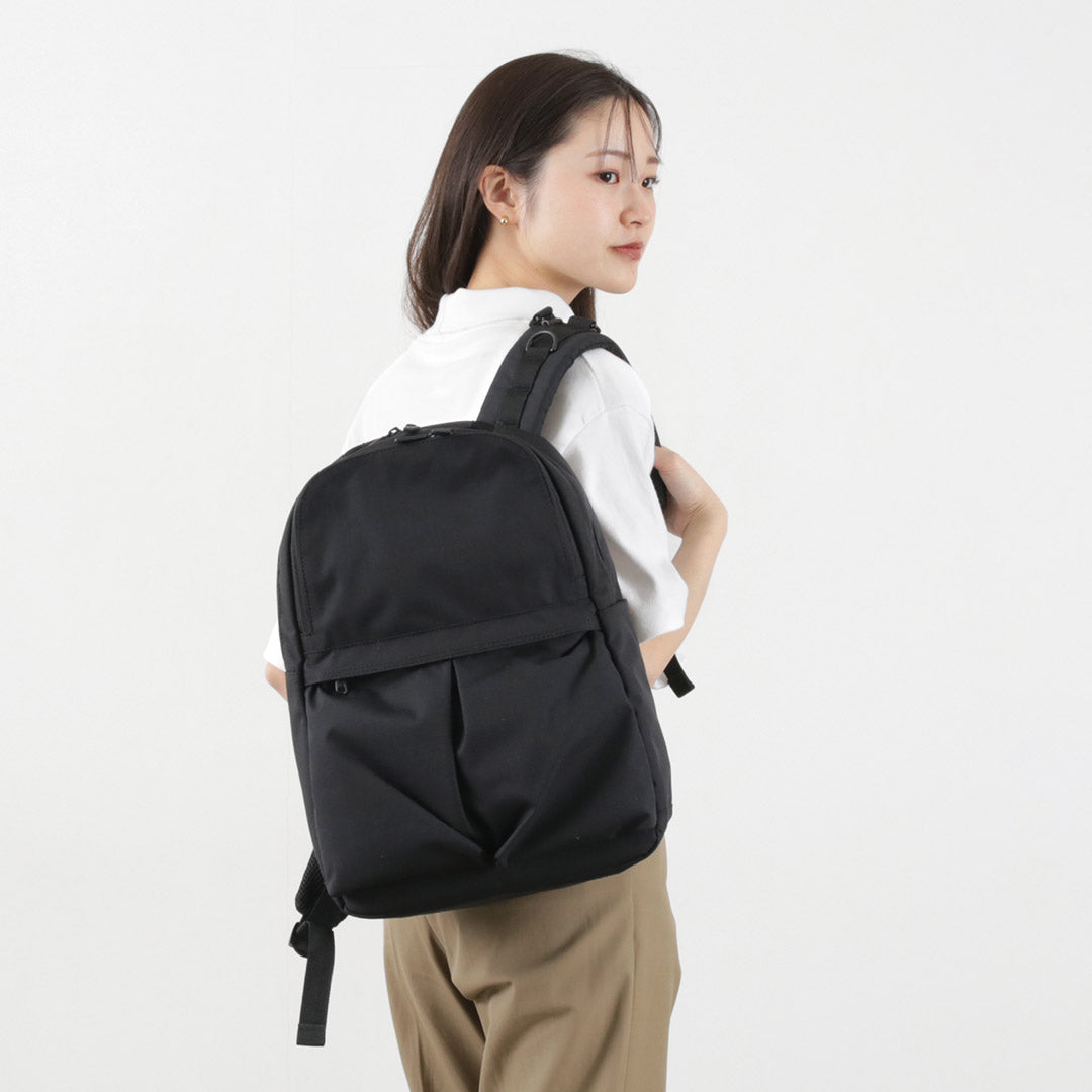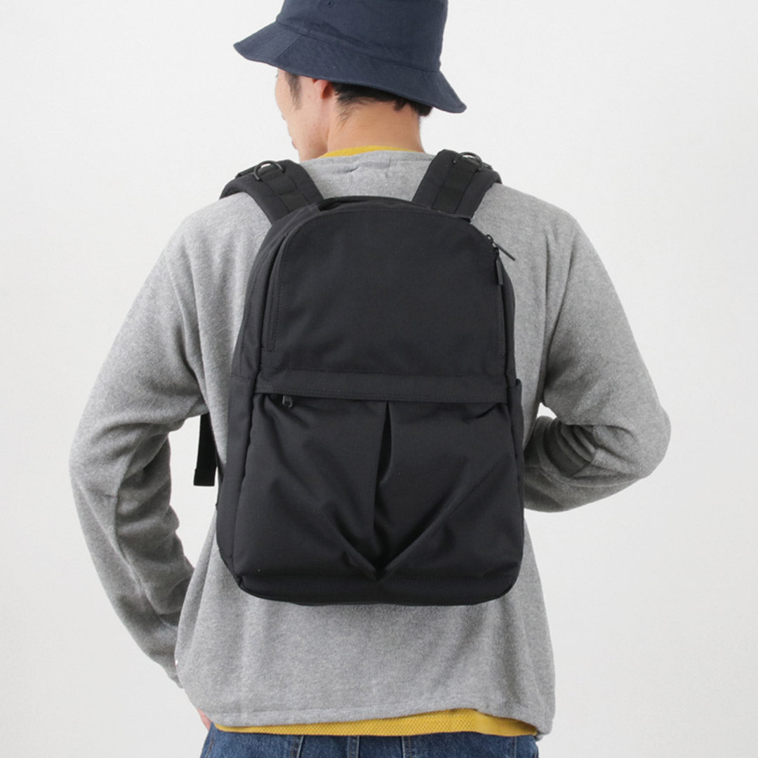 The design of this daypack is based on the helmet bag, which originated when U.S. Air Force pilots carried their favorite helmets. It features a helmet bag-style arrangement tucked into the front pocket.