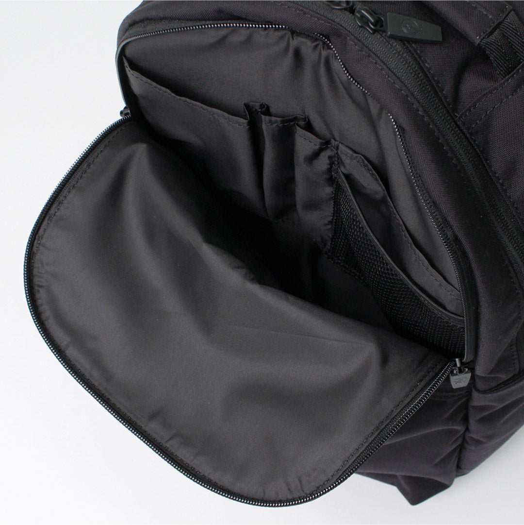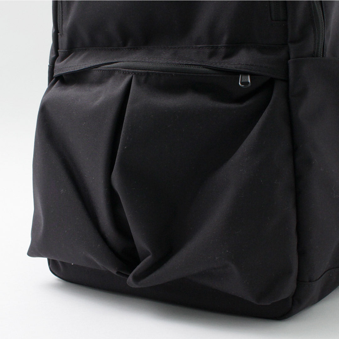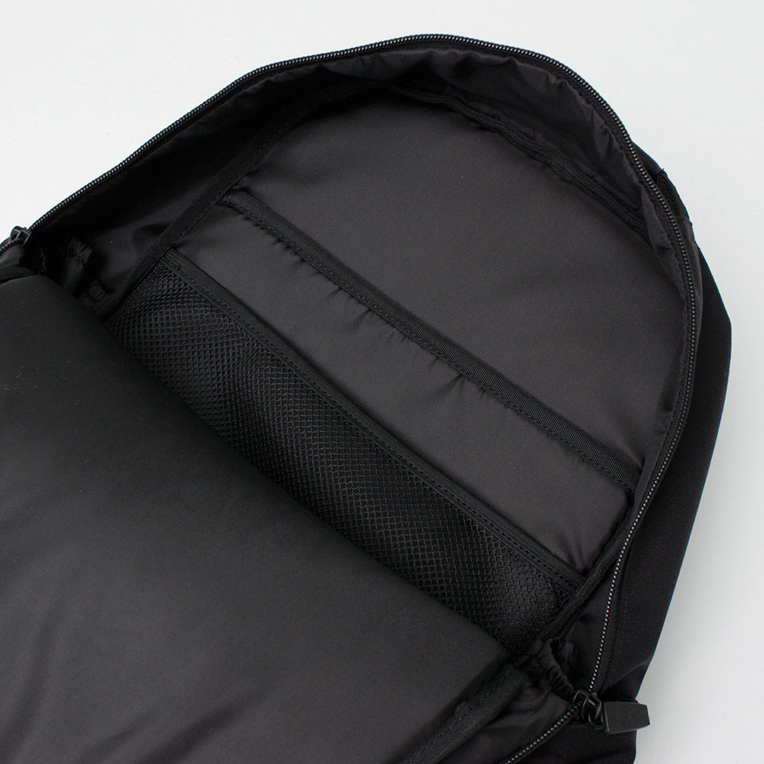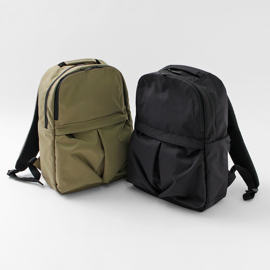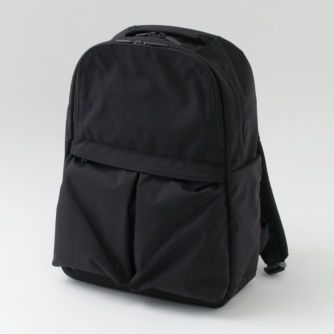 The design of this daypack is based on the helmet bag, which originated when U.S. Air Force pilots carried their favorite helmets. It features a helmet bag-style arrangement tucked into the front pocket.