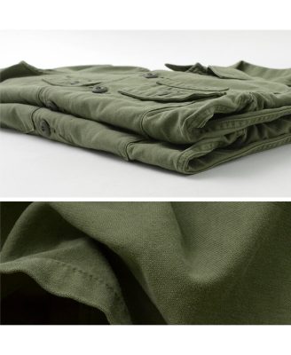 It incorporates authentic military details such as the use of durable ‘BDU buttons.’ The cuffs are finished with cuffs, emphasizing both strength and sophistication in the details.