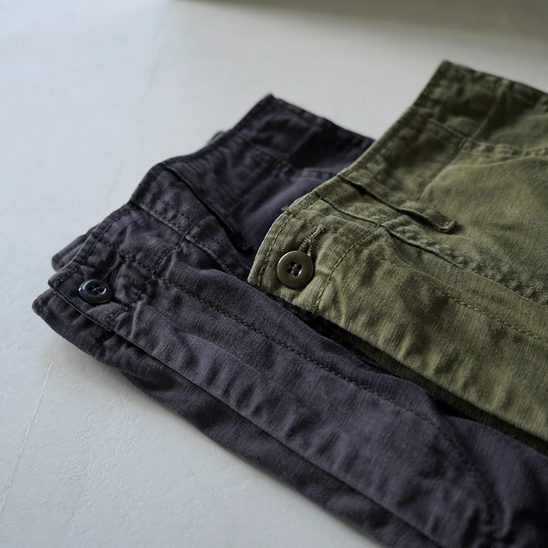 Using “back satin” fabric, which was used for U.S. military combat uniforms in the mid-1950s, the cotton material is treated with sulfur dyeing, giving it a vintage finish. The realistic fading and unique texture become more pronounced over time, offering a deep, personal experience.