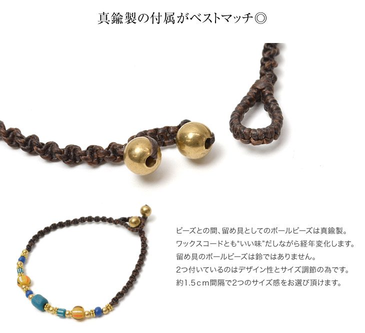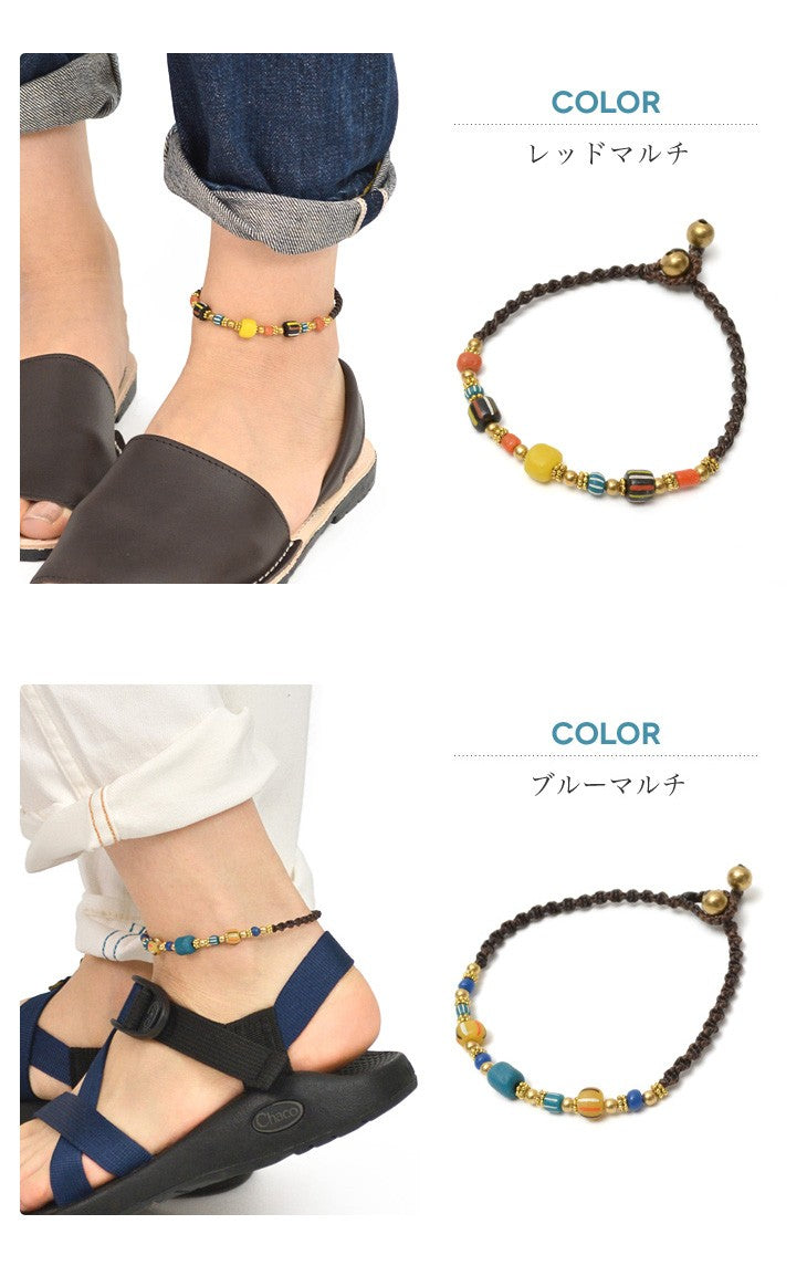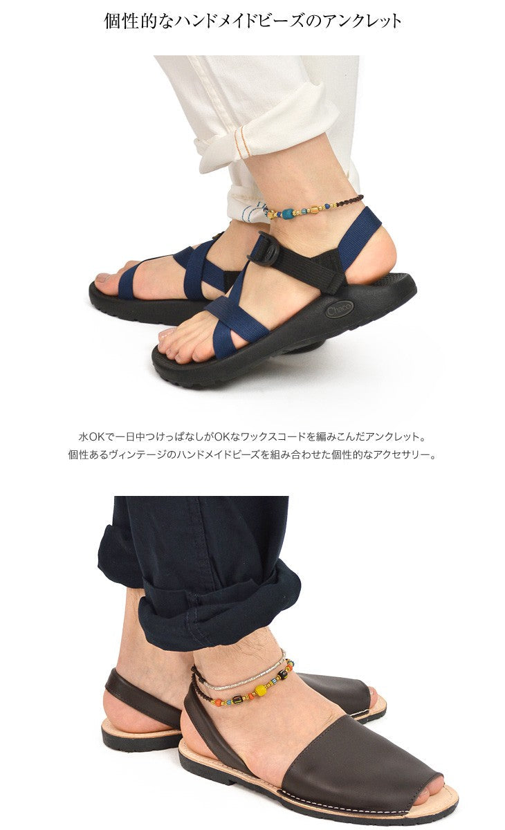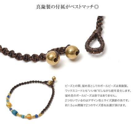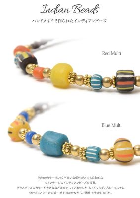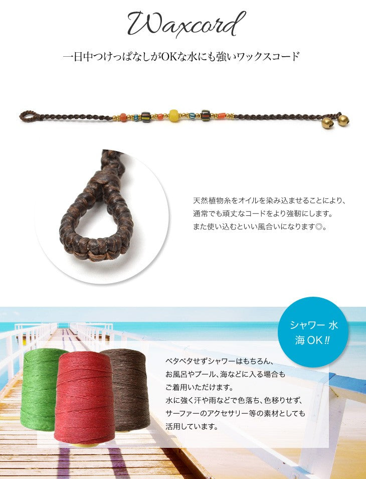 This braided waxed cord anklet is water safe and can be left on all day. The anklet is made with vintage handmade beads for a unique accessory. â Handmade Vintage Indian Beads We use vintage Indian beads that have a unique colouring and uneven character that is very striking. The colour and size of the glass beads is not stable, but we have tried to keep a certain uniformity by separating them into red multi and blue multi. Waxed cord is tough and water-resistant enough to be left on all day long The natural plant yarn is soaked in oil to make the normally strong cord even tougher. It also gives the cord a nice texture. It is not sticky and can be worn in the shower, in the bath, in the pool or in the sea. The fabric is also water resistant and will not fade or bleed when exposed to sweat or rain, making it an ideal material for surfers’ accessories. Brass accessories are the best match The ball beads between the beads and the clasp are made of brass. The ball bead is made of brass, which will change over time, giving it a nice touch with the wax cord. The two ball beads are not bells, but are there for design purposes and size adjustment. The two ball beads are for design and size adjustment. It is also available in two sizes for unisex use by both men and women. They are also available in two sizes for unisex use. You can also wear them in layers depending on your mood or purpose.