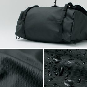 The front features a large zippered pocket under the flap. The opening of the main compartment is reinforced with an under-flap rain guard to securely protect your belongings.