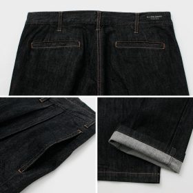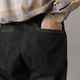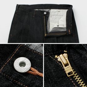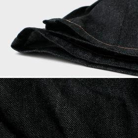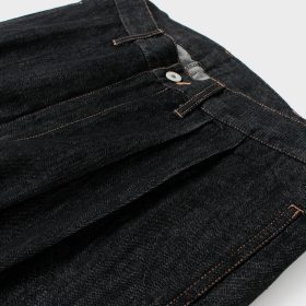 This piece is made from 11.5oz medium-weight black denim. Medium weight refers to fabric that is neither too light nor too heavy, providing a comfortable balance of wearability and durability.