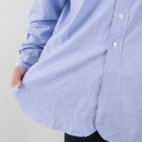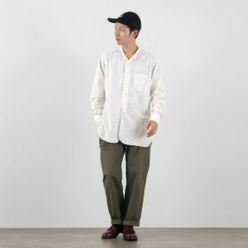 The silhouette is a regular fit with a slightly roomy sizing. The back yoke is positioned higher than that of a regular shirt and side pleats are employed.