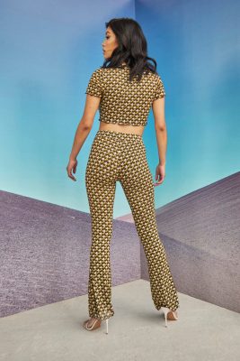 Glamorous Care Khaki Hounds tooth High Waisted Trousers. We cant get enough of these print trousers featuring a super on trend flattering fit. Join our positive journey towards reducing the impact that fashion has on our planet by styling this with matching co ord top some heels for the evening or trainers for the daytime for the perfect environmentally friendly look.