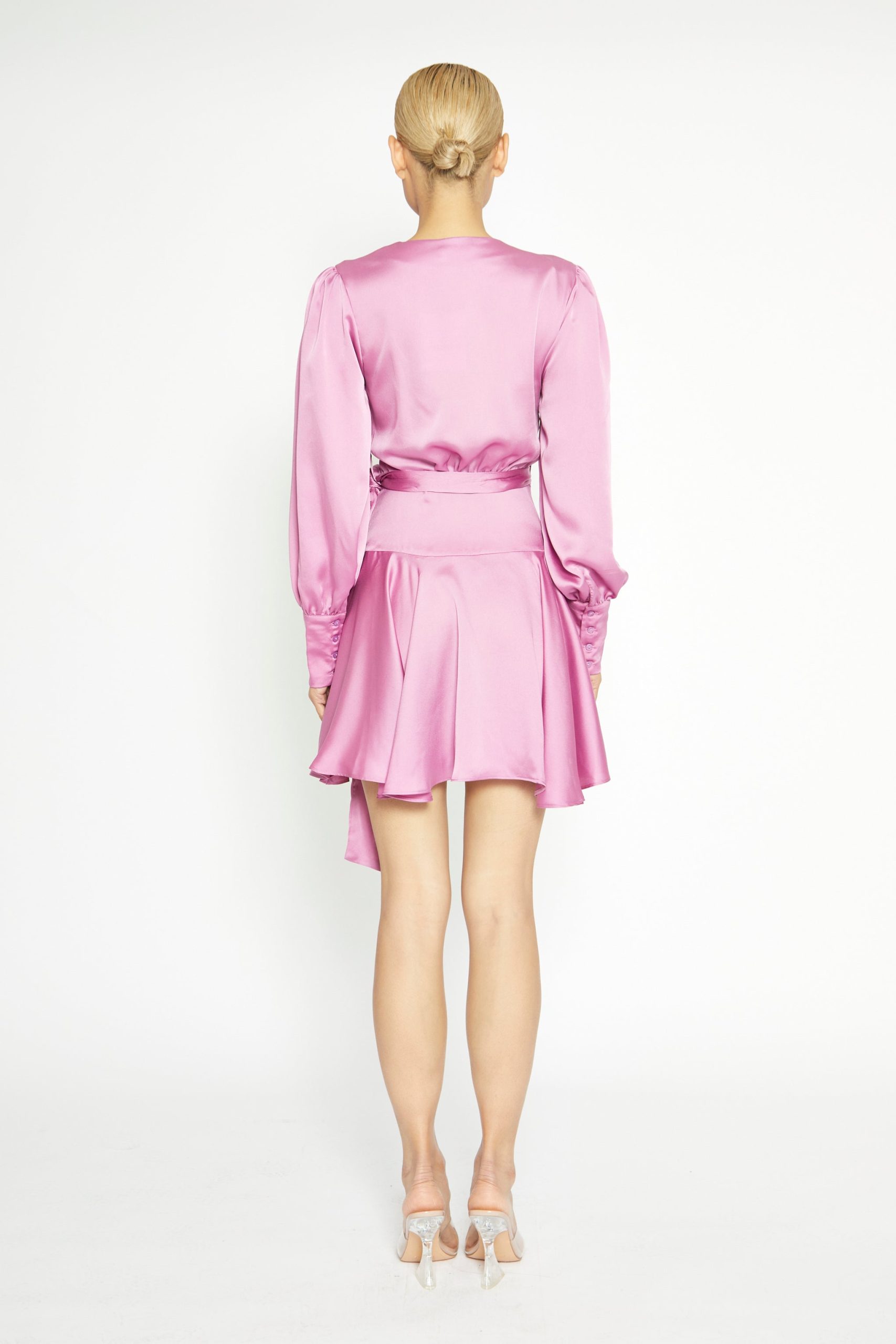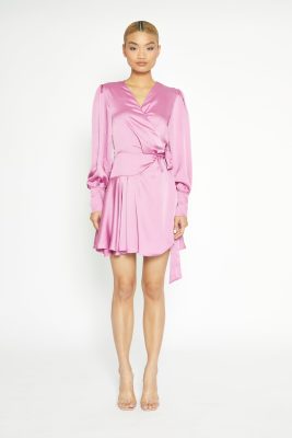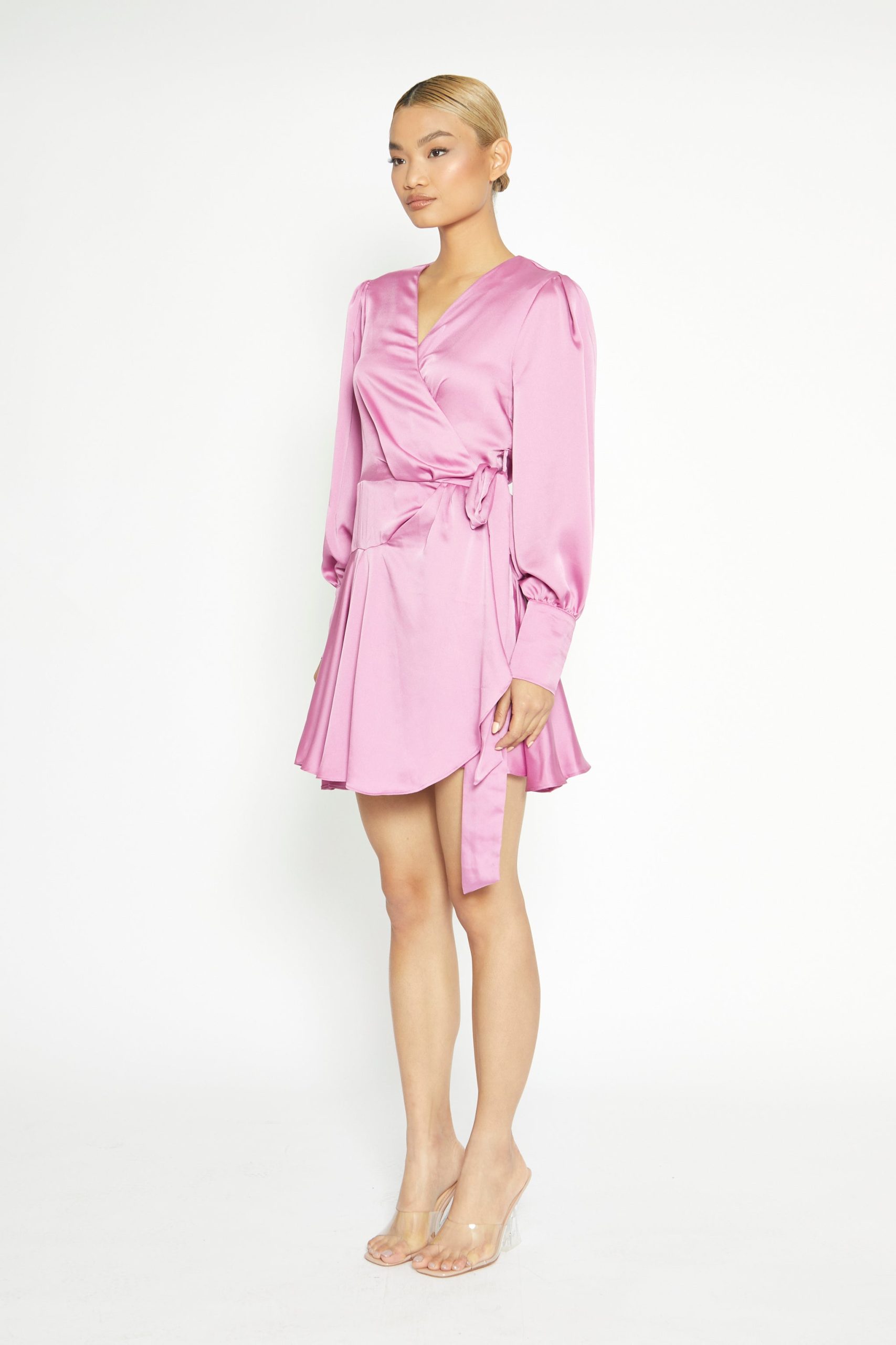 Glamorous Orchid Long Sleeve Mini Wrap Dress. Look pretty in pink with this glam mini dress. This super flattering dress features a wrap front design and long sleeves. Looks fab paired with some cute strappy heels and a clutch for the ultimate stylish look!