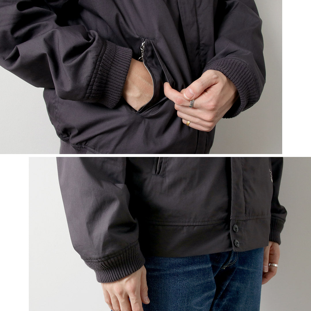 The fabric is made from nylon-cotton weather material, a functional fabric that was popular in 70s outdoor scenes. When exposed to moisture, the cotton swells and blocks the weave, enhancing the waterproof effect.