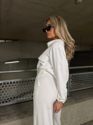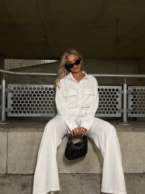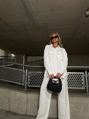 Glamorous Studio Womens Off White Wide leg High Waisted-Trousers. Get ready to strut your style in these off white wide leg trousers! Made for the bold and fashion-forward, these trousers provide a comfortable and stylish fit with their loose, flowy legs. Perfect for any occasion, these trousers will have heads turning and compliments flowing. Style with the matching top for a relaxed trendy look!
