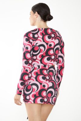 Glamorous Care Pink Circle Print Drawstring Ruched Crop Top. This standout sustainable piece is going to have you turning heads. Featuring a gorgeous pink circle print, an adjustable drawstring ruched design and a cropped fit, this top wont fail to impress! Style with the matching co-ord skirt and a pair of knee high boots for the perfect evening look.
