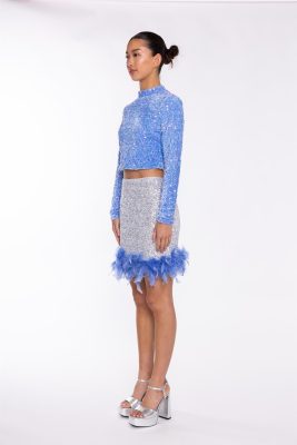 Glamorous Women’s Silver-Sequin Blue Feather-Hem Mini-Skirt. Sparkle and shine in our Silver-Sequin Blue Feather-Hem Mini-Skirt. This dazzling piece features a captivating sequin fabric that catches the light and turns heads wherever you go. The feather trim adds a playful, whimsical touch, while the mini length keeps things flirty and fun. The fully lined construction ensures a smooth, comfortable fit, so you can dance the night away with confidence. Pair this statement skirt with a simple camisole and heels for a night out, or dress it down with a tucked-in tee and sneakers for a more casual vibe. Whether you’re hitting the town or just running errands, this versatile skirt is sure to make you feel fabulous.
