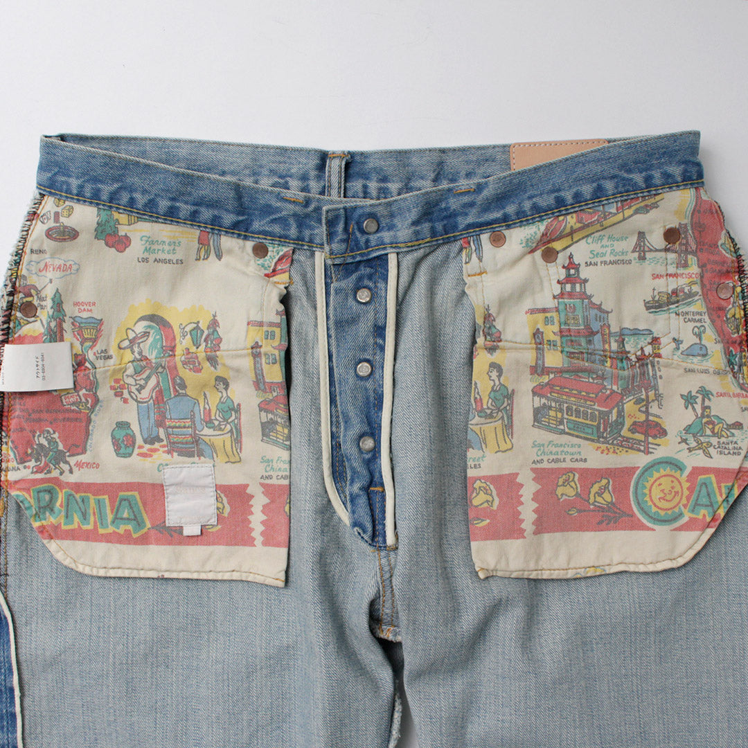 A simple 5-pocket design with a button fly. The pocket linings feature original brand print sleying, enhancing the design.