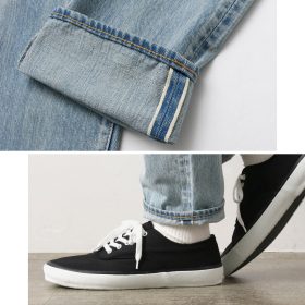 The hem rolls up to reveal the selvage, adding a stylish accent to your footwear coordination.