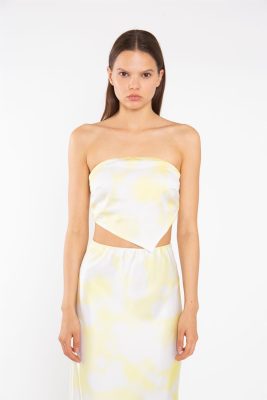 Glamorous Women’s Yellow Print-Satin Bandanna-Scarf Crop-Top. Get ready to turn heads in our Yellow Print Bandanna-Scarf =Top! This unique piece features a =strapless design, and cropped length for a flirty look. The fully lined fabric and tie back provide both comfort and style. Pair with the matching skirt and stand out from the crowd in style!
