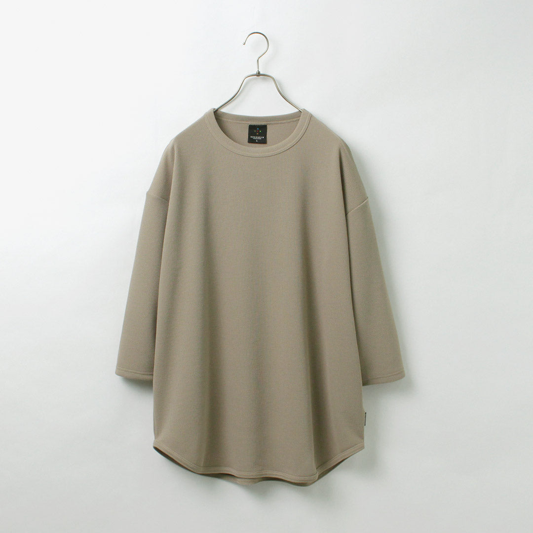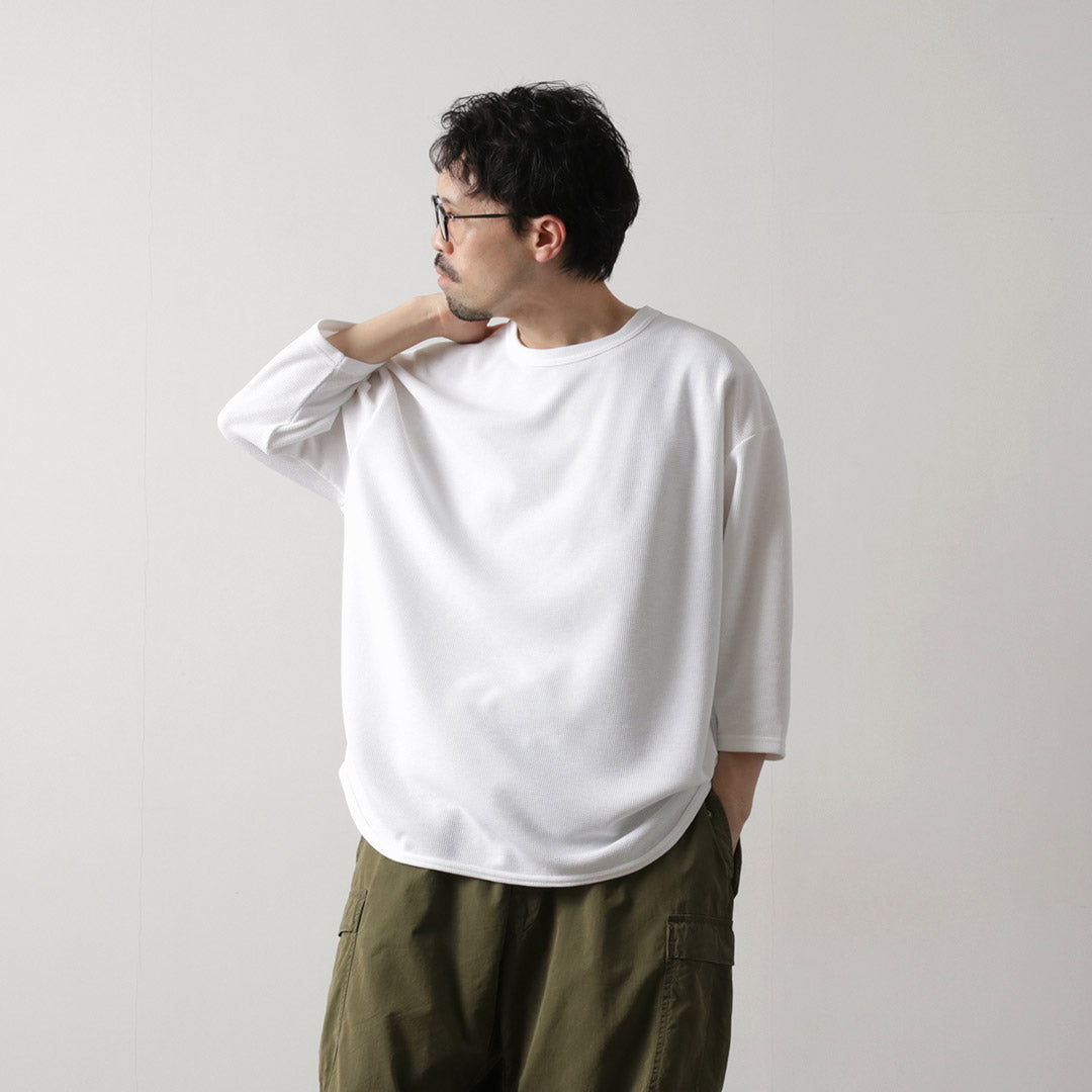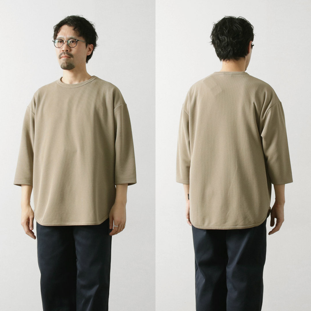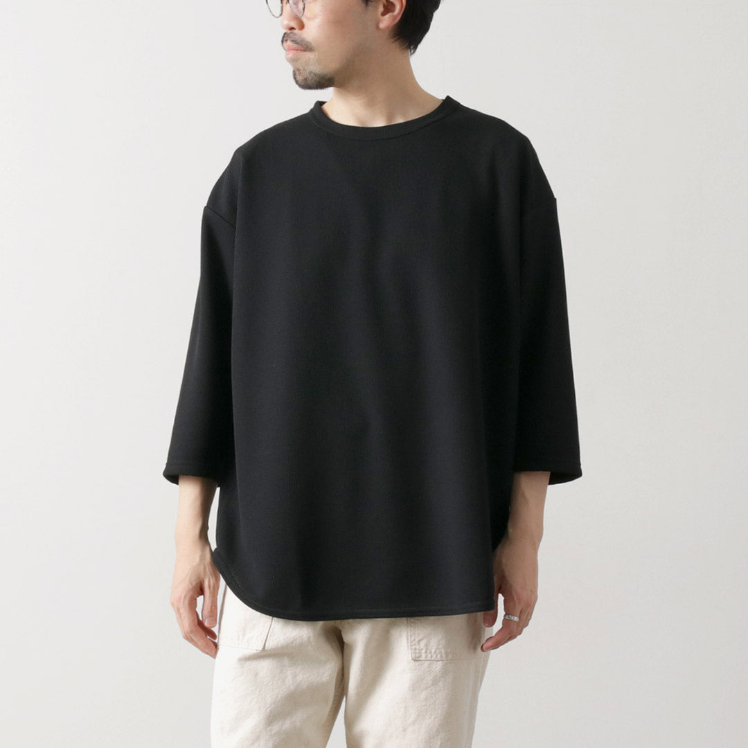 Featuring a classic crew neck, this design maintains a clean and versatile aesthetic. The three-quarter length sleeves offer the perfect balance for transitional seasons and provide an excellent option for those who prefer more coverage than short sleeves.