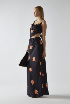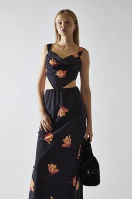 Glamorous Women’s Black-Orange Flower Hanky-Hem Tie-Back Crop-Top. Add a touch of elegance to your winter occasion wear with this stunning black-orange flower hanky-hem tie-back crop top. The vibrant floral design beautifully contrasts with the dark fabric, making it a standout piece for festive gatherings or special events. The cropped length is perfect for pairing with high-waisted trousers or the matching skirt, creating a chic and coordinated look that’s sure to turn heads. The unique hanky hem adds a playful flair, while the tie-back feature allows for a customizable fit that flatters your figure. Fully lined for comfort, this crop top is designed to keep you feeling confident and stylish throughout the evening. Dress it up with strappy heels and statement jewellery for a polished look, or layer it under a tailored blazer for a sophisticated touch. This top is all about making a statement while keeping things comfortable, making it an ideal choice for winter celebrations, cocktail parties, or holiday dinners. It’s a piece that effortlessly combines fun and elegance, ensuring you shine at any occasion.