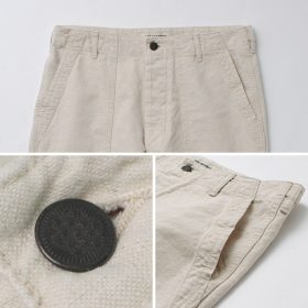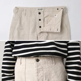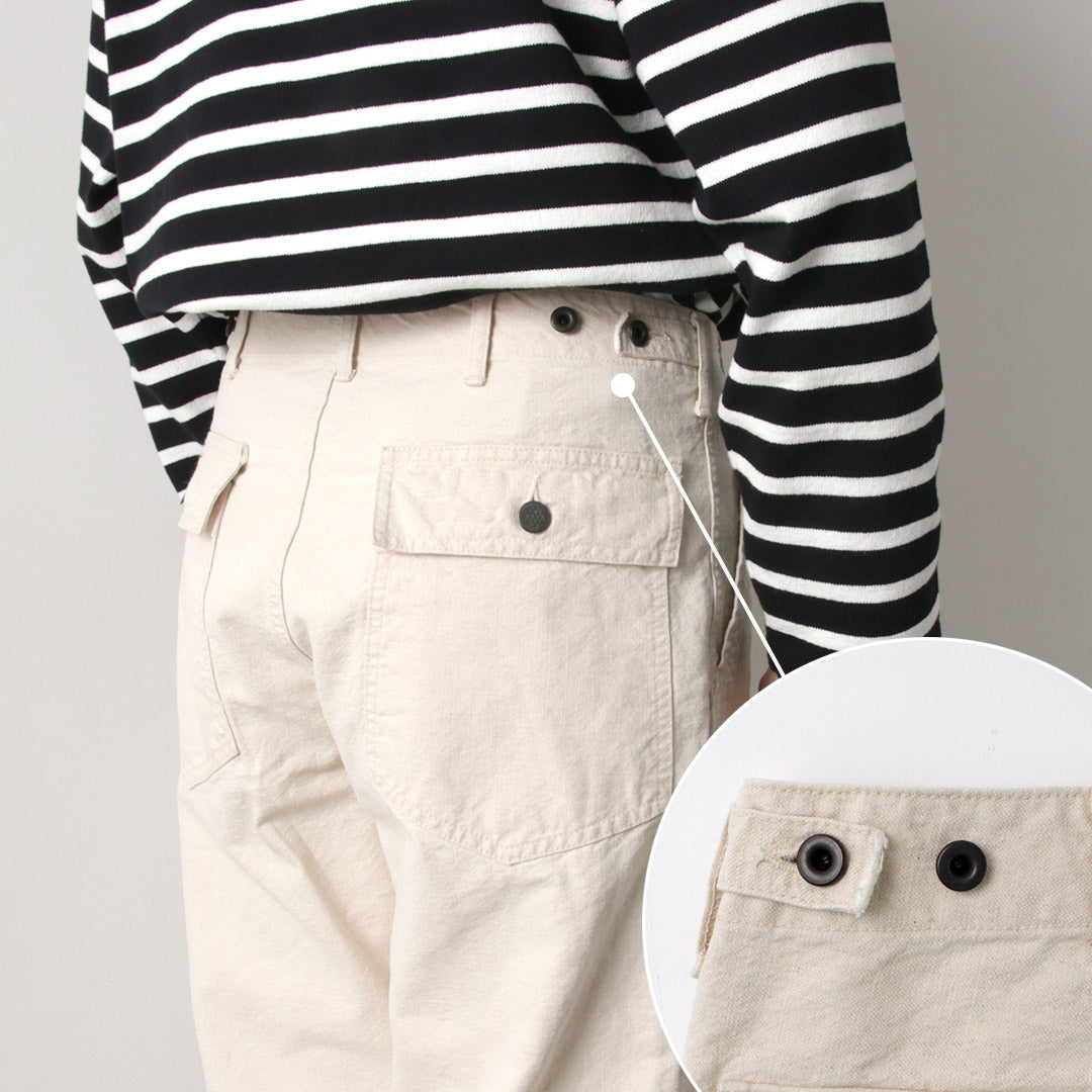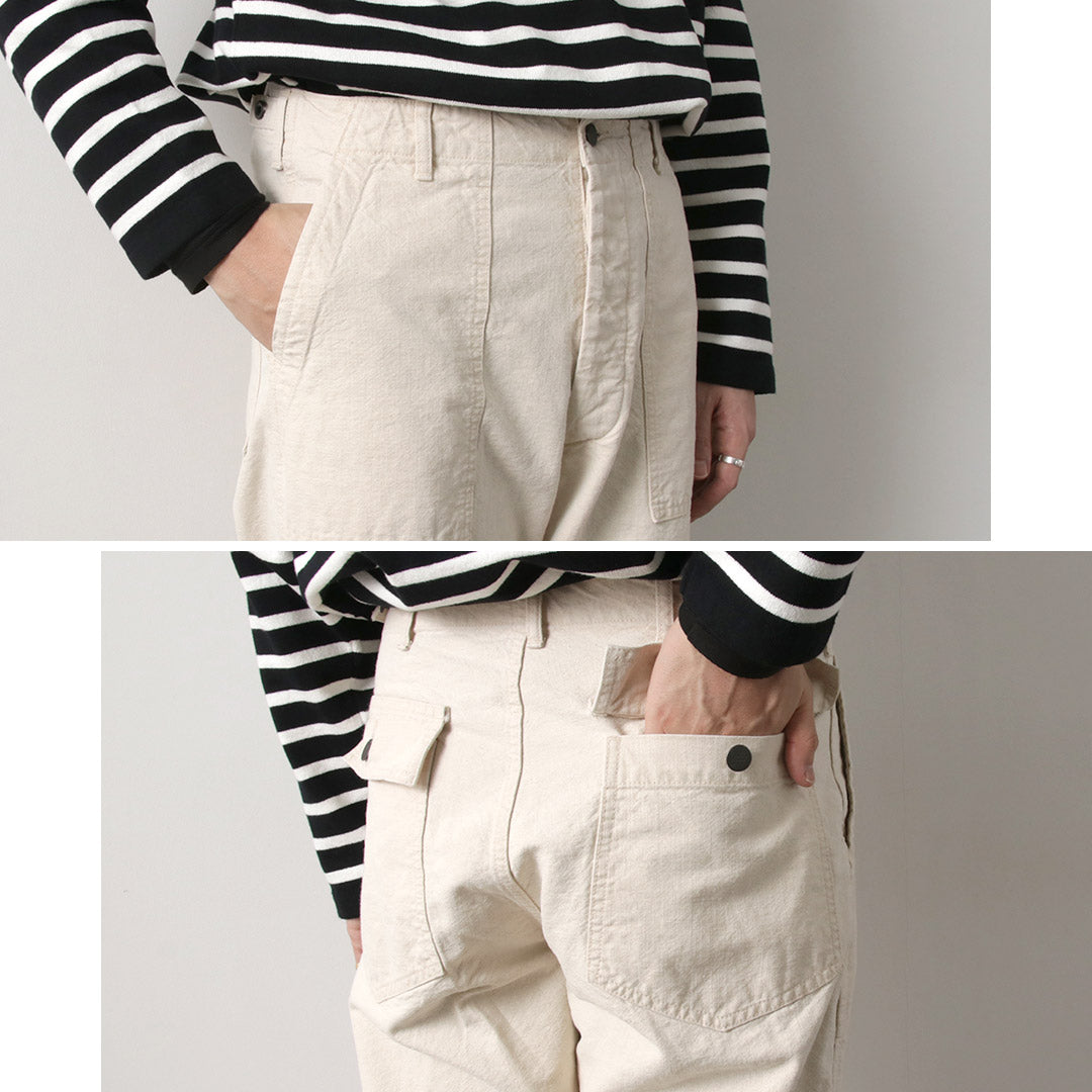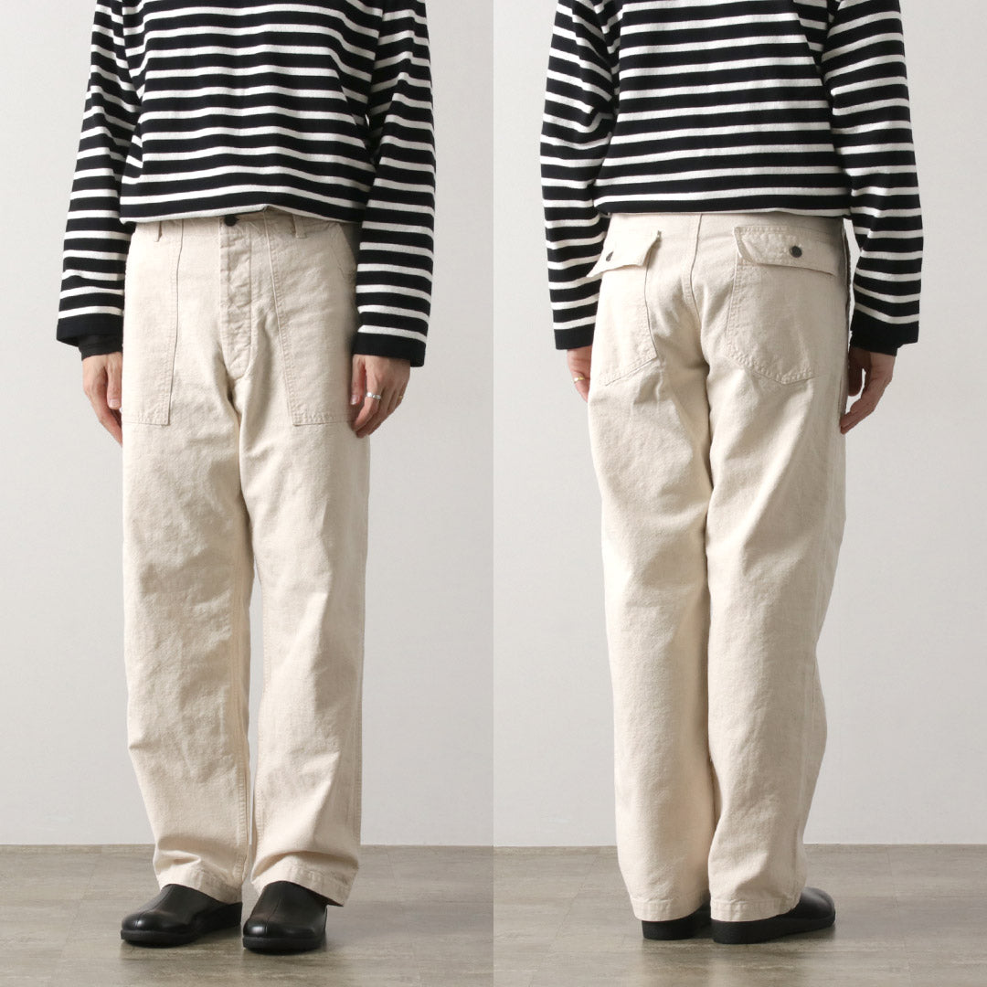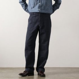Maintaining the rugged appeal of classic fatigue pants, this style has been updated to fit modern sensibilities. The pants feature a slightly wide, relaxed silhouette with a gradual tapering at the hem, resulting in a clean, streamlined look. The silhouette offers comfort and ease without excess bulk, making it versatile for both casual and refined outfits.