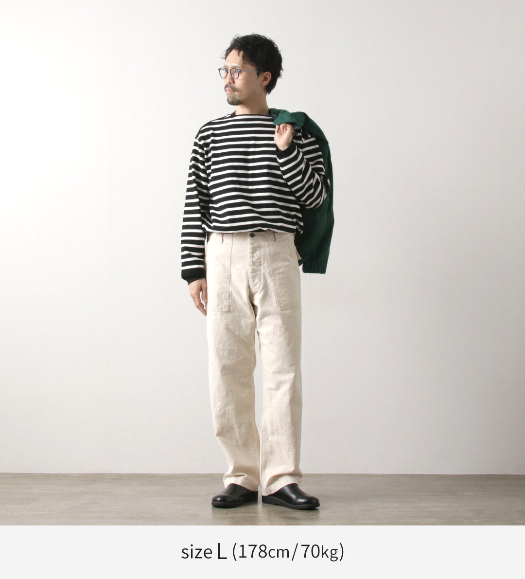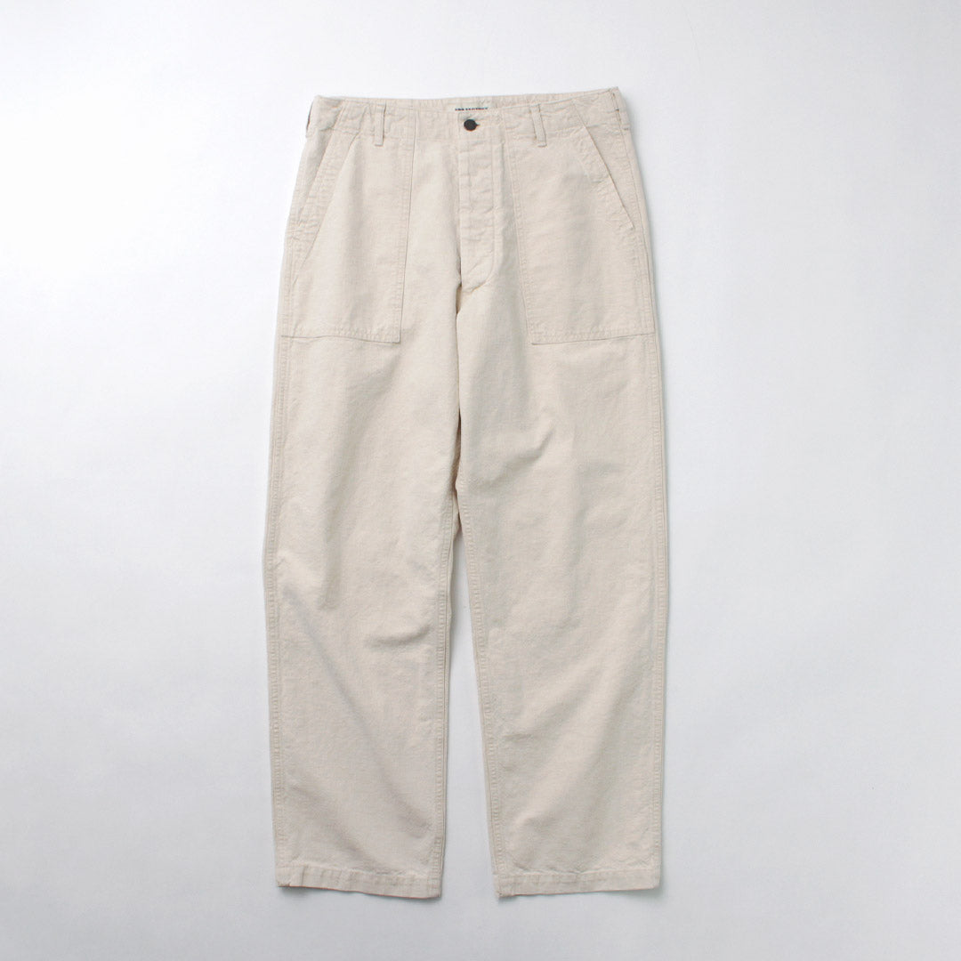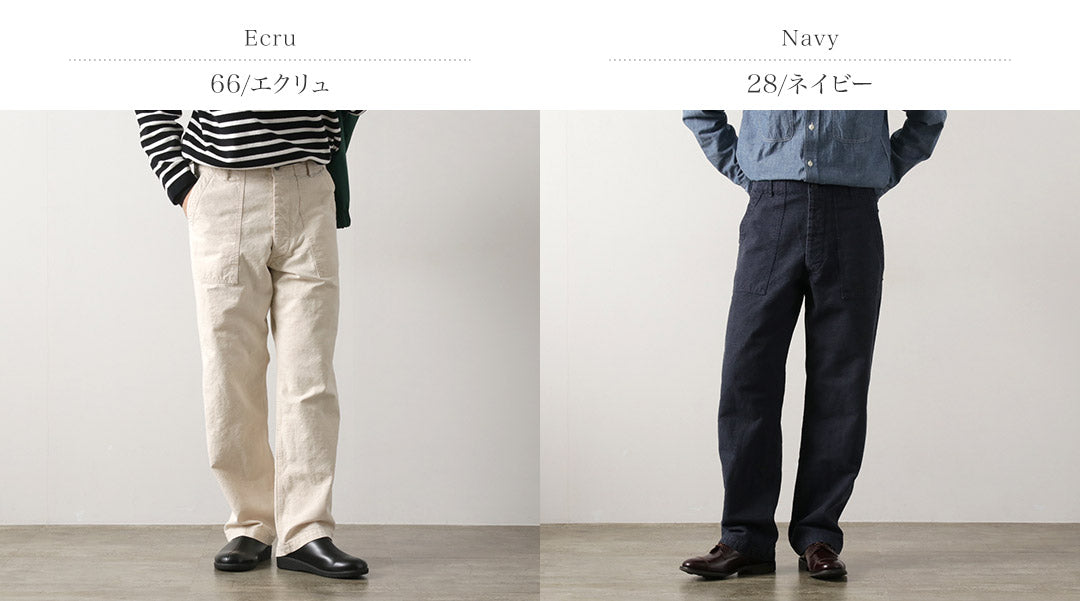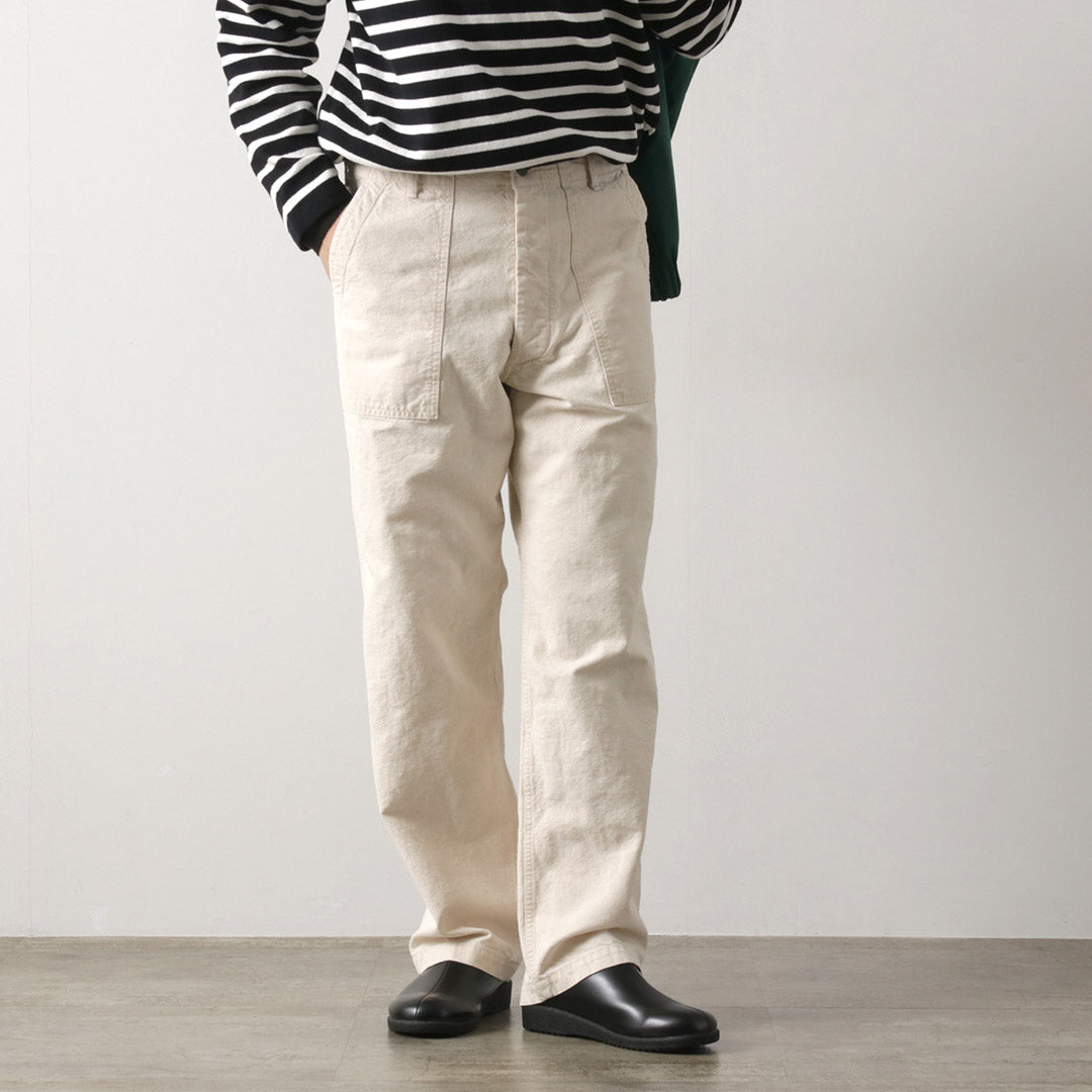 Maintaining the rugged appeal of classic fatigue pants, this style has been updated to fit modern sensibilities. The pants feature a slightly wide, relaxed silhouette with a gradual tapering at the hem, resulting in a clean, streamlined look. The silhouette offers comfort and ease without excess bulk, making it versatile for both casual and refined outfits.