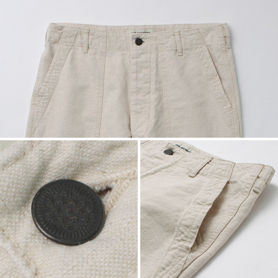 Made with durable hemp cotton, the fabric has a firm texture with a natural feel that softens with use over time. The distinct roughness of hemp, combined with the soft quality of cotton, creates a unique, rugged appearance. Furthermore, repeated wear and washing bring out a rich patina and fading that enhance the garment’s character.