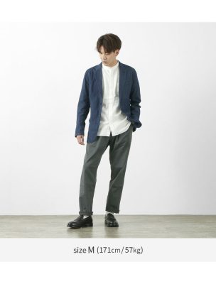 Simple two-button, classic collar with Notched lapel. The pocket flaps can be in or out. Buttons are also deployed at the cuffs as in tailored suits, and you can roll up the sleeves and wear them out. The