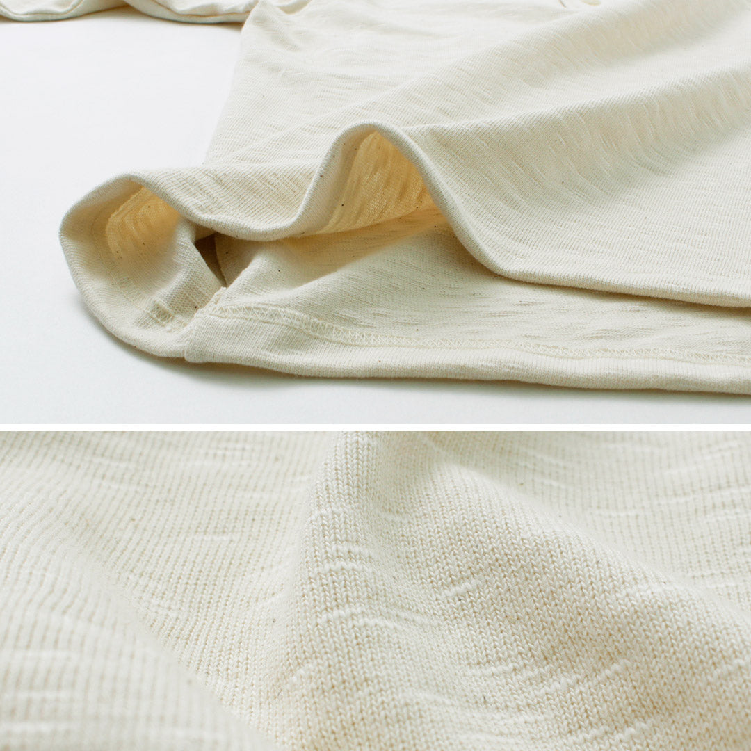 This is made of “HDCS/ultra high-density jersey slub cotton”. Compared to cotton fabrics used for ordinary T-shirts, this fabric is knitted slowly and densely at about 1/3 the speed of ordinary cotton fabrics, making it firm yet soft to the touch.