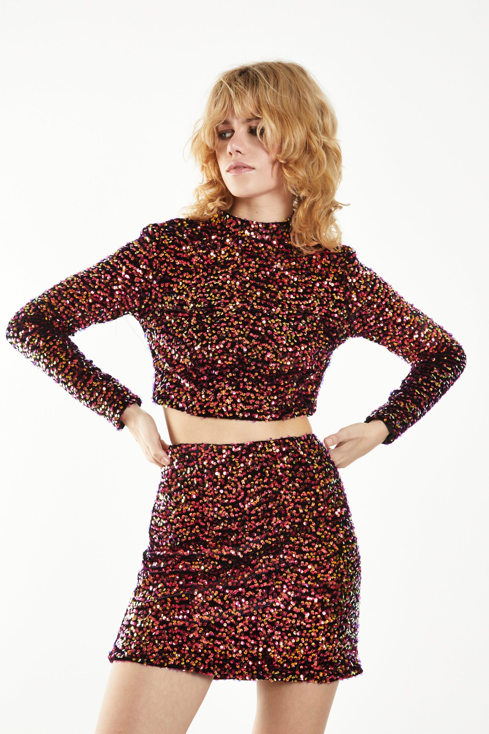 Glamorous Pink Sequin Velvet Skinny Fit High Neck Top. Opt for sequins with this top. Featuring a skinny fit, long sleeves and high neck, this top is perfect for drinks out with the girls. Make sure to pair with the matching skirt for a stand out co-ord look.