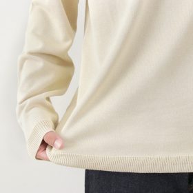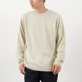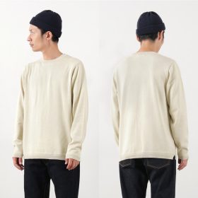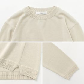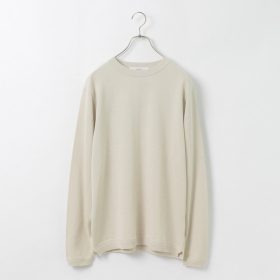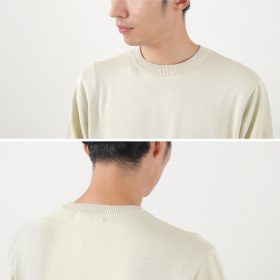 Made from extremely fine cotton knitted at 12 gauge. The fabric, finished in jersey stitch, features a subtle sheen and smooth texture.