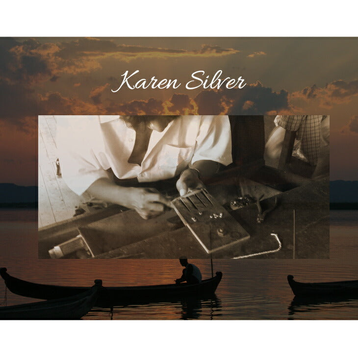 High purity silver is handcrafted by a small group of mountain tribes in Myanmar and northern Thailand. The purity of Karen silver is approximately 95-99.9%, compared to 92% for most silver jewellery. Each piece of Karen silver is handmade with a slightly different shape, and the warmth of the look is its greatest appeal. It is the most popular silver in Europe and the United States for its simplicity and presence.
