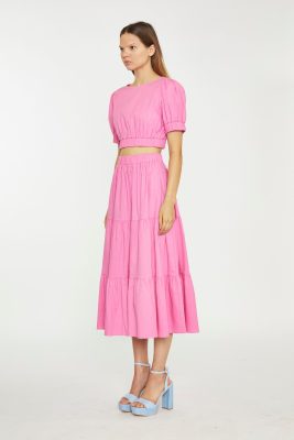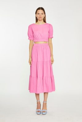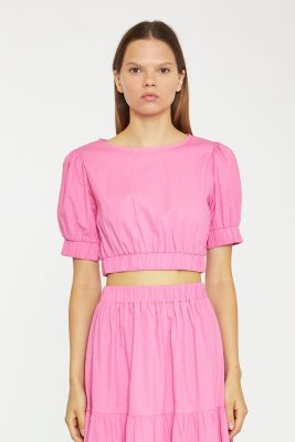 Featuring a beautiful Azalea pink colour and puff sleeves, this crop-top is both trendy and unique. The fitted silhouette and crop length provide a flattering fit while the back zip closure adds a touch of sophistication and style.