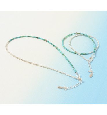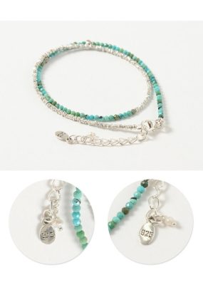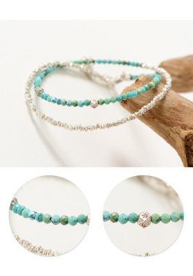 Small cut turquoise beads with a charming shine. The combination of the two materials in this bracelet is a perfect balance. The bracelet is made from a combination of turquoise beads and Karen silver.