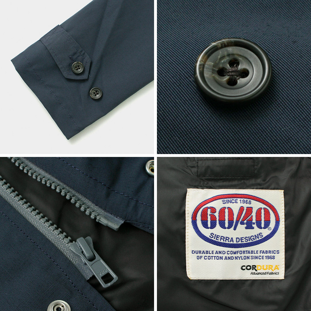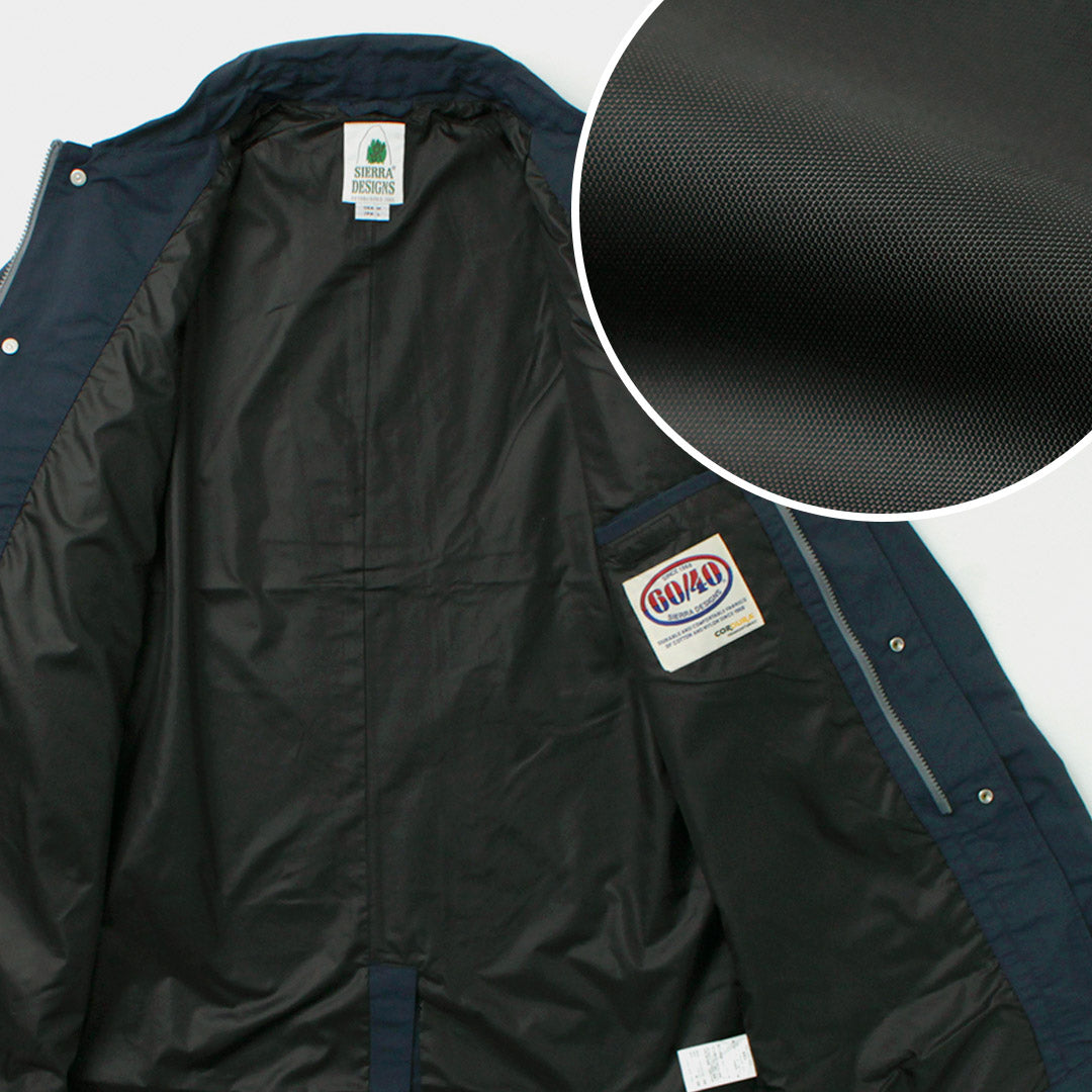 A revolutionary material developed by SIERRA DESIGNS in 1968, “60/40 (Rokuyon cloth)” is used. The fabric is made up of 60% cotton for the weft and 40% nylon for the warp, making it less stiff than 100% cotton and more resistant to friction than 100% nylon. When it absorbs moisture, the cotton threads in the weft expand and close the weave, making it waterproof and windproof.